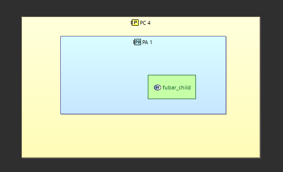 No special settings, visualizing parent (as described above) and dragging the childs on the PAB diagram (first dragging to the blue than to the green). If I add a port to the child, it gets automatically added to the parent. or if I drag a port from parent to child, it just gets “duplicated”.