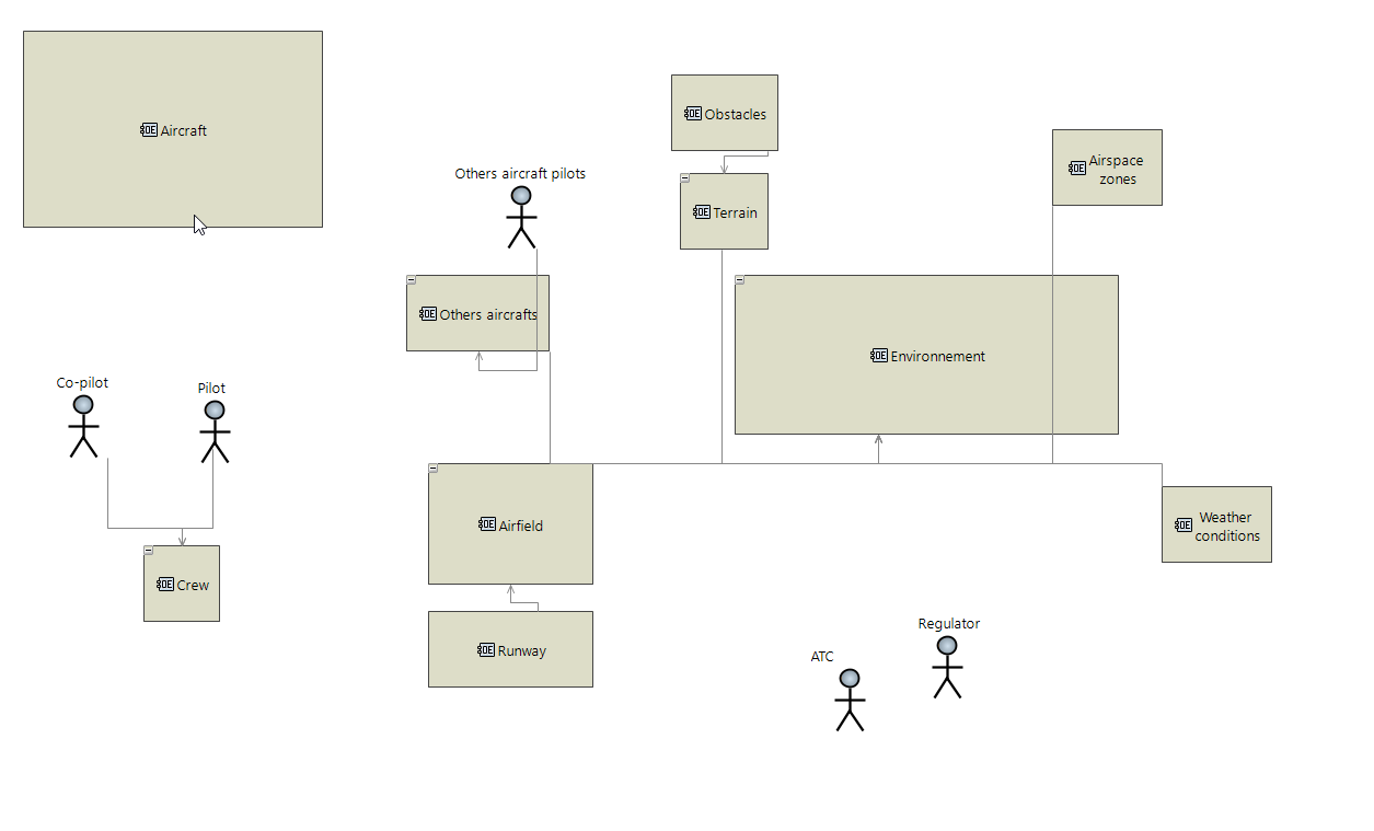 The hardware aspect is very classical in this industry, so I don’t believe that Capella would help us with the physical architecture (you have controllers, sensors, sticks, actuators, …). However, it might be very useful mainly for the software aspects, and also to help defining in details the softwares functionnalities of the aircraft. I will be also be very useful to define requirements such as “reaction time is less that 20ms …” and to validate them. Also, to choose the exact controler, sensor, … even though the physical architecture is already defined”.
