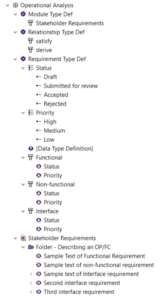 Each of the three requirement types have two attribute definition enumeration: Status & Priority. (They are all linked to their respective Enumeration Data Type Definition as well.)