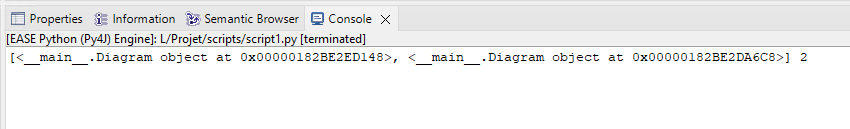 Thanks for your response. I just replaced the code with what you suggested. The console does return a list with two elements, but it doesn’t display their names. Can this be fixed? I’m actually running some tests to be able to generate Excel files that include the names of the diagrams contained in a model.