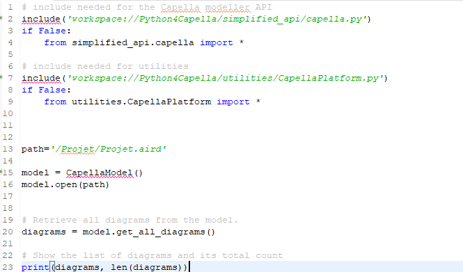 I’m using Capella 7.0 and have installed Python4Capella. Within a Capella project named “Projet”, I created a script in which I want to retrieve the list of all diagrams from my model. The problem is that every time I use the get_all_diagrams() function, Python returns an empty list.
