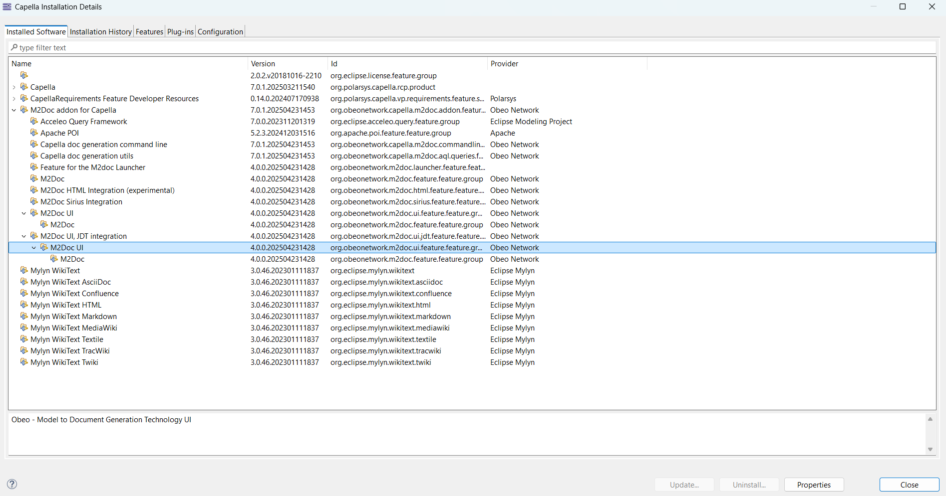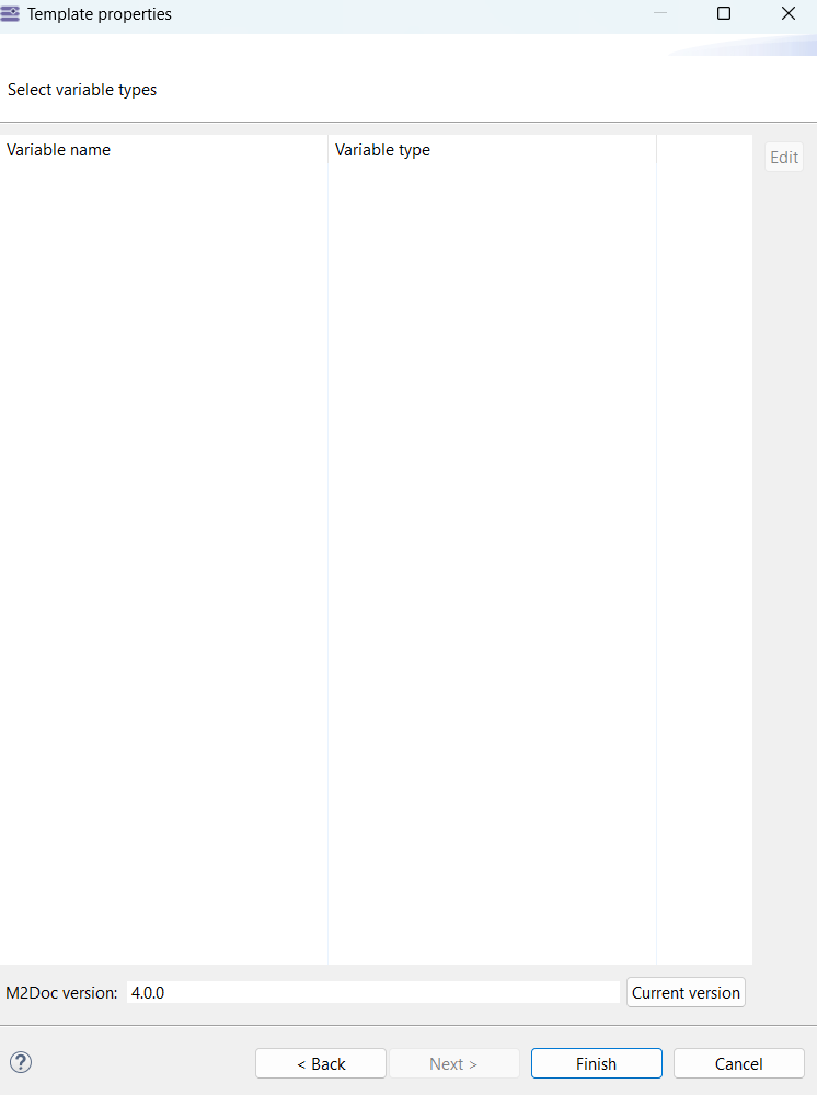 I also installed RP and M2doc add-ons (M2doc version 4.0.0), but it seems in no way I am able to set the M2doc variable. This is what I get from the docx template properties (empty list of variable names)