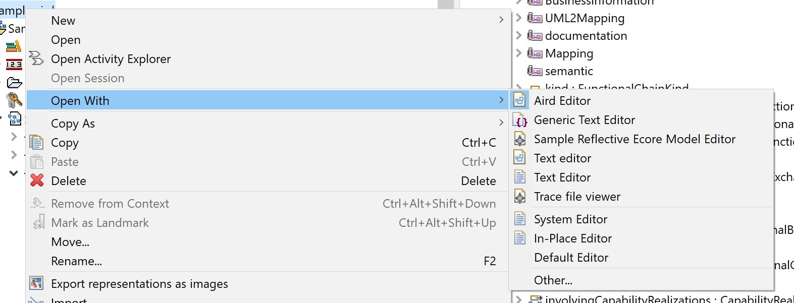 By opening the .aird file of the Capella project with the Sample Reflective ECore Model Editor