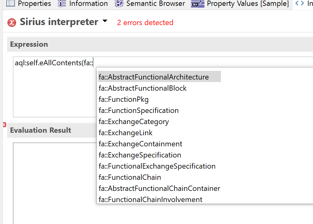I am using extensively AQL both to support model editing and template testing. I found that auto-completion does not support all metamodel packages. As an example fa:: is missing.