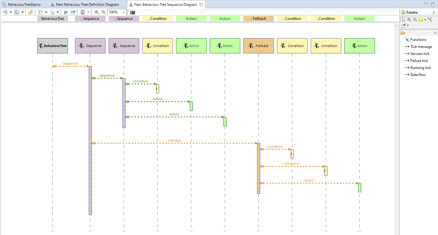 In my opinion it would be better to implement BTree notation as part of Capability Realisation mechanism. It would be more consistent than mixing BTree control flow with data flow on functional decomposition level (conditions, decorators, sequences and selectors are not functions (actions)).